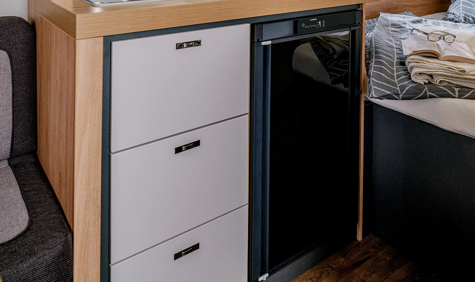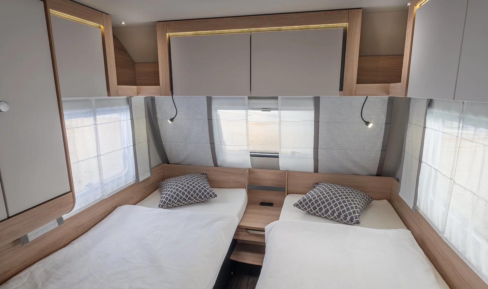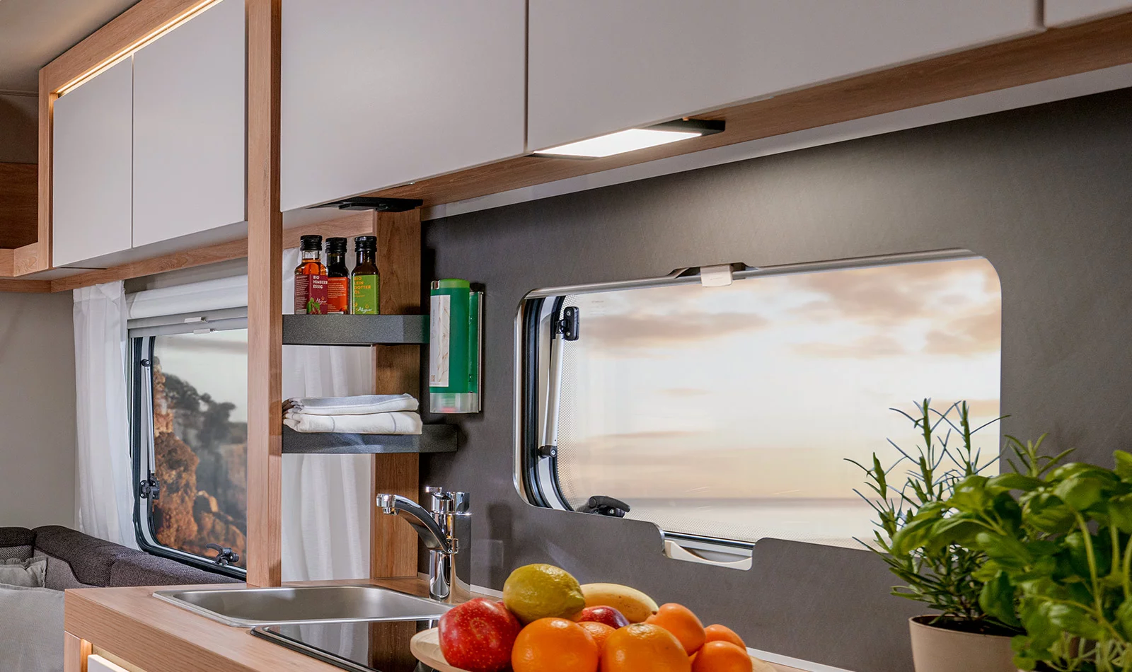 De KNAUS SPORT caravan biedt alles wat u nodig heeft voor een comfortabele en stijlvolle vakantie. Het interieur is niet alleen praktisch, maar ook bijzonder elegant vormgegeven. Dankzij slimme indelingen, veel opbergruimte en sfeervolle verlichtingsconcepten geniet u altijd van een aangename omgeving. De caravan biedt talrijke opties voor de badkamer, het bed en de keuken, evenals hoogwaardige afwerkingen zoals metalen meubelgrepen en soft close plafondkasten. Het innovatieve CLEANFLEX-toilet zorgt voor meer hygiëne zonder extra water of chemicaliën.