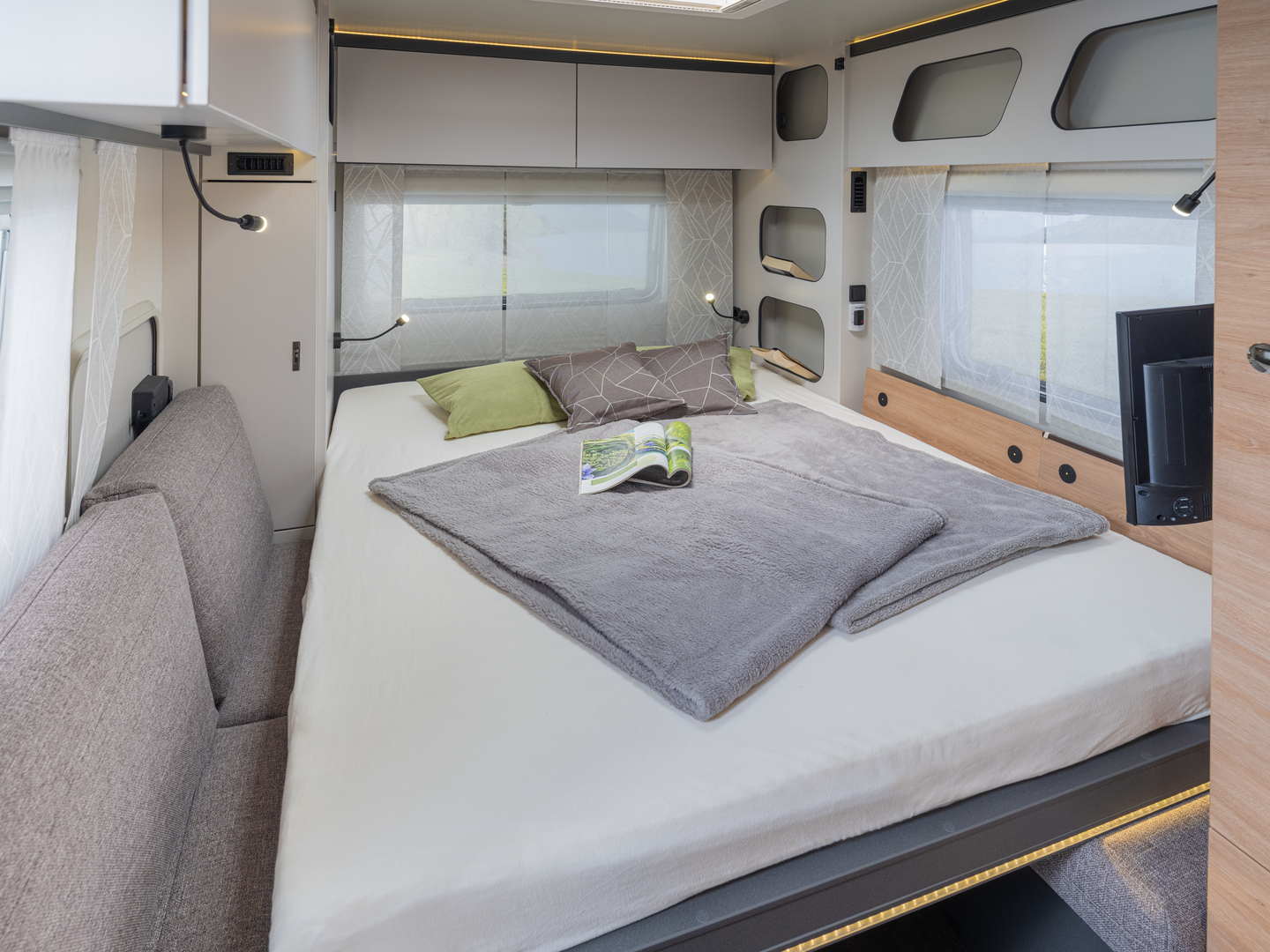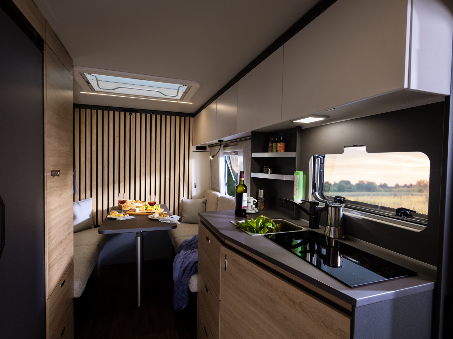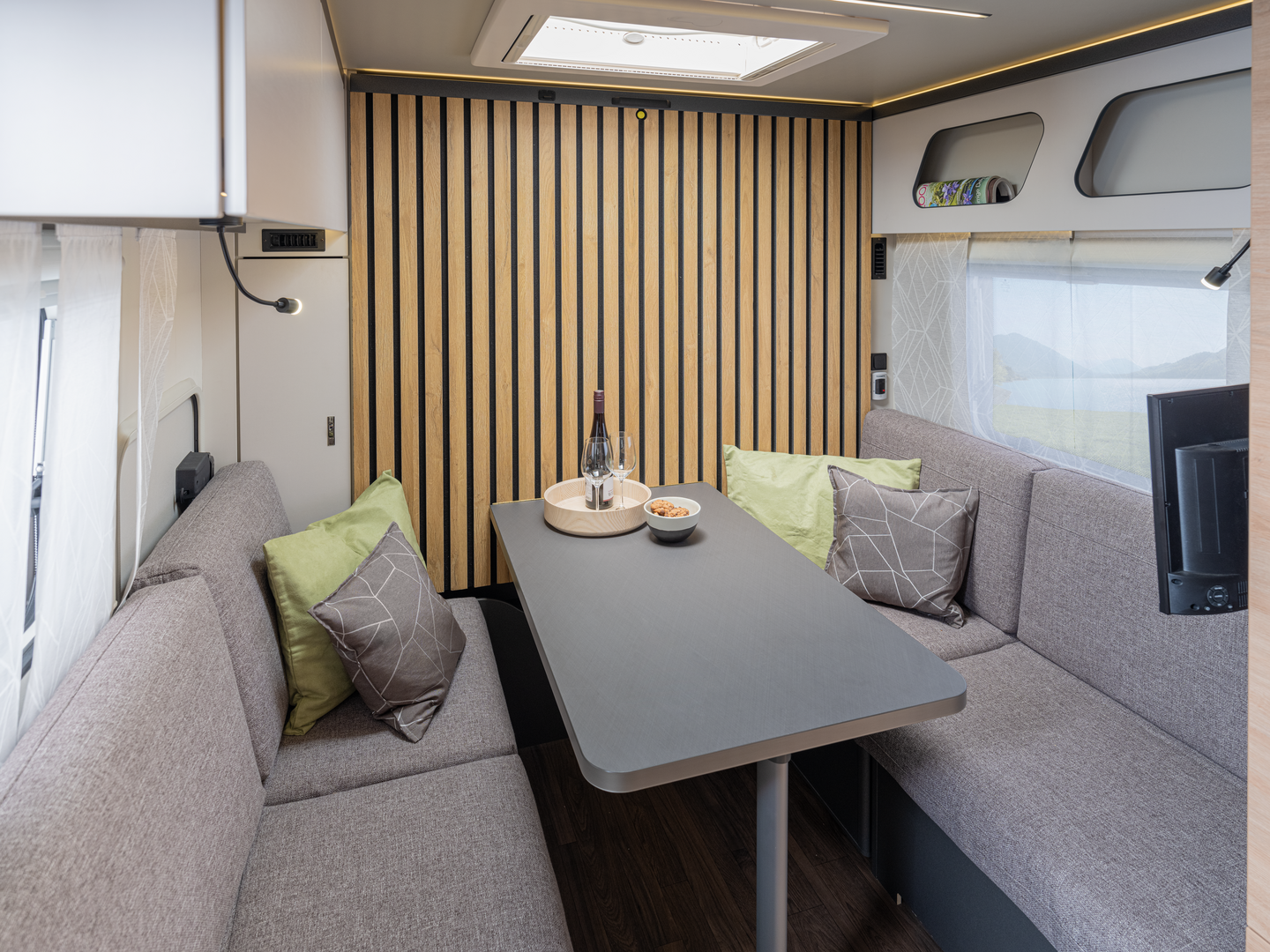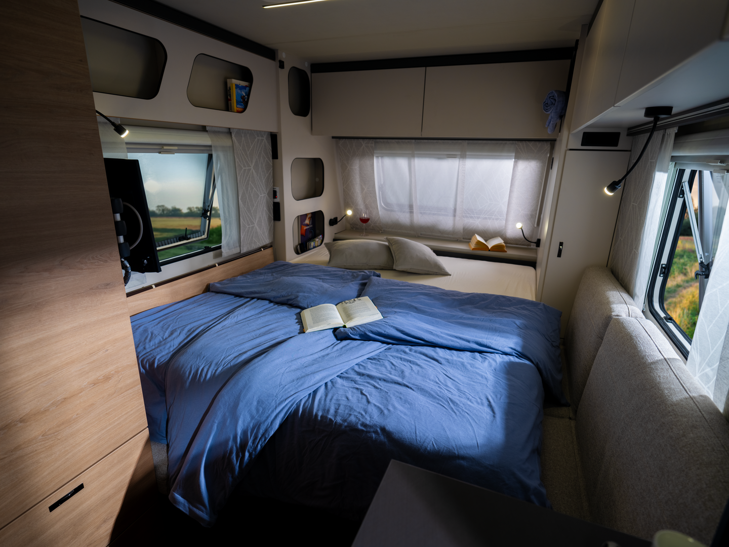 In de woonruimte toont de Yaseo zijn veelzijdigheid: hij transformeert van opbergruimte tijdens het reizen naar een eetruimte voor avondmaaltijden en ‘s nachts naar een knus bed. Ervaar totale vrijheid zonder compromissen met de Knaus Yaseo, uw toegang tot onafhankelijk reizen in slechts een compacte caravan.