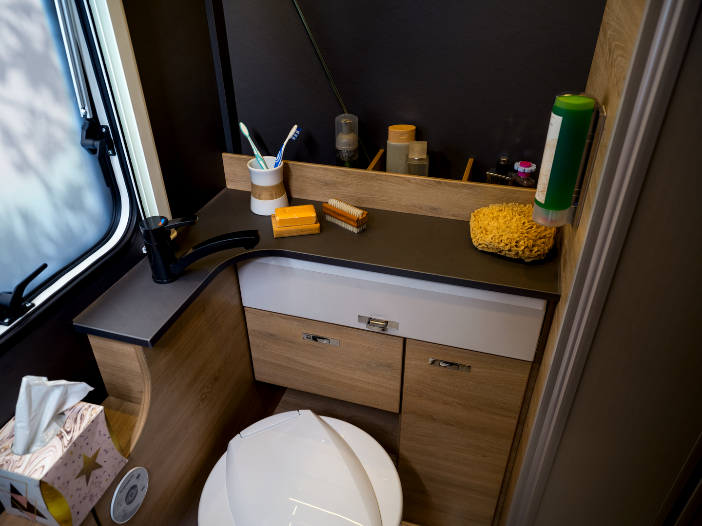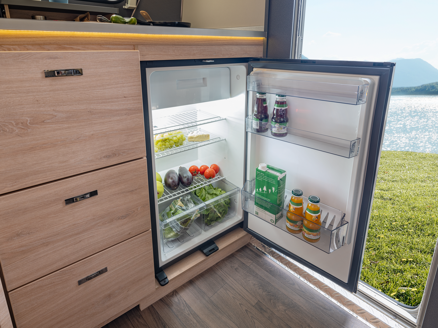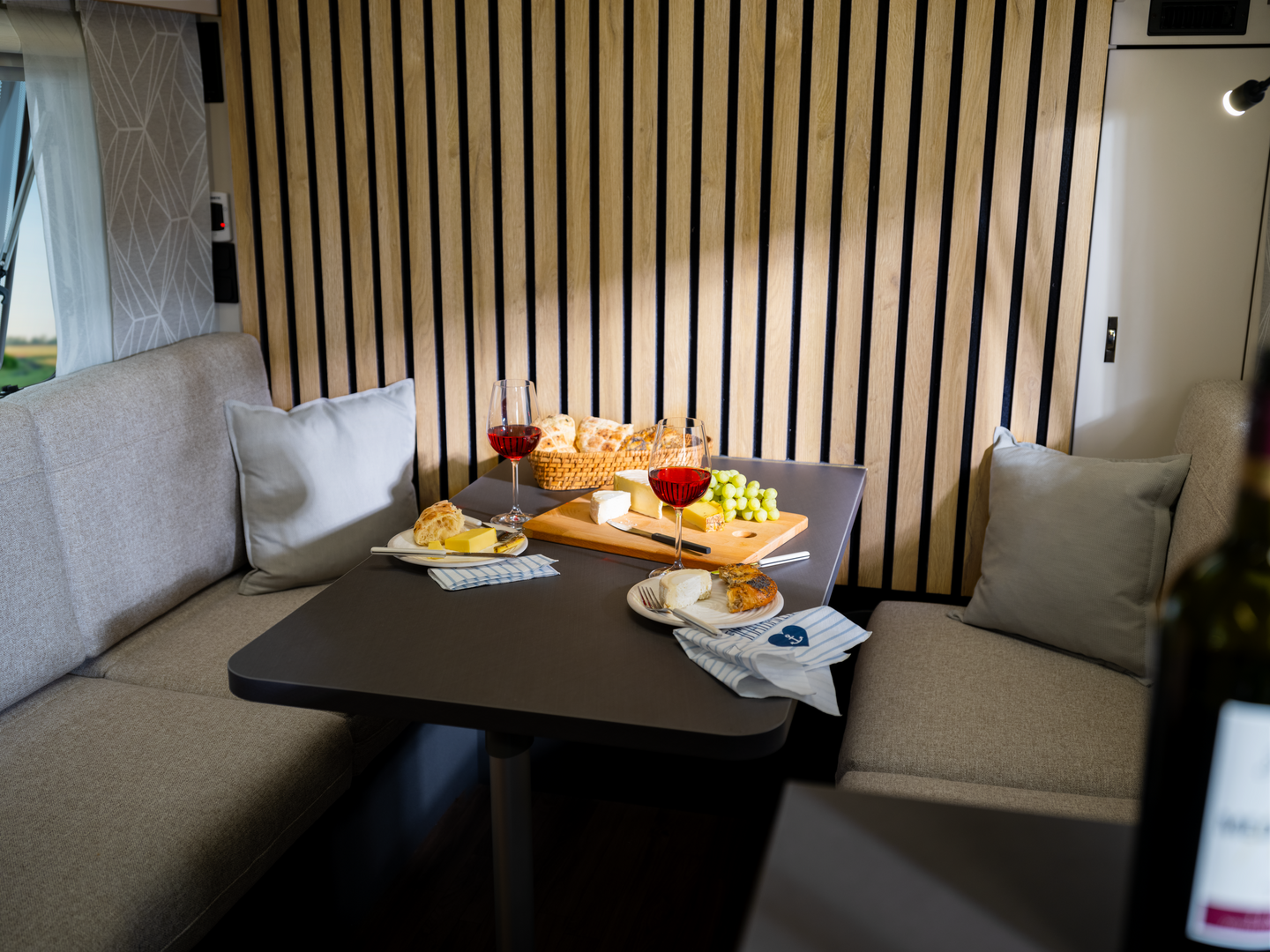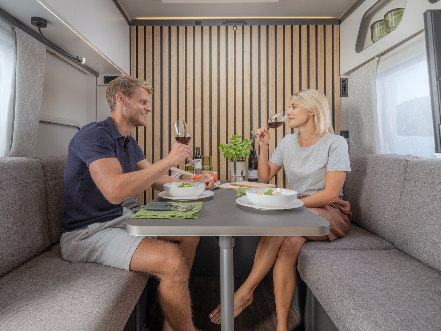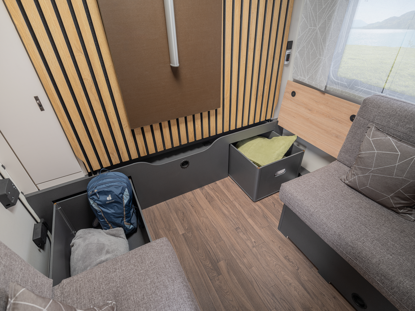 In de woonruimte toont de Yaseo zijn veelzijdigheid: hij transformeert van opbergruimte tijdens het reizen naar een eetruimte voor avondmaaltijden en ‘s nachts naar een knus bed. Ervaar totale vrijheid zonder compromissen met de Knaus Yaseo, uw toegang tot onafhankelijk reizen in slechts een compacte caravan.